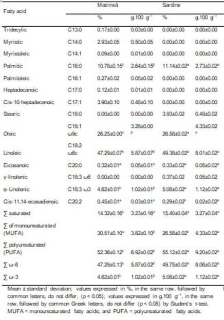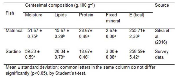 Table 1 shows the mean values for the centesimal composition of canned matrinxã and freshwater sardine.