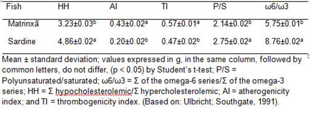 The thrombogenicity index also displayed low values: 0.57 in matrinxã, and 0.47 in sardine. Similar values were found by Bentes et al. (2009), who analyzed three species of Amazon fish (gurijuba, Arius parkeri; piramutaba, Brachyplatystoma vaillantii; and dorado, Salminus maxillosus), and by Ramos Filho et al. (2008), who evaluated the nutritional quality of dorado (0.35)