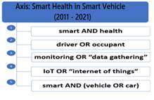 As mentionedpreviously, for the filtering of the selected articles, we conducted a search for articles in the Capes Journal Portal and Google Scholar search engines, with the general search through the string search generated from the basic protocol of the review (Figure 1, item 2 - Representativeness test of the Bibliographic Portfolio). In the third stage of the search and selection process (Figure 1, item 3), the search string test was performed directly in order to obtain the GP. To perform this analysis, three articles were randomly chosen in order to identify the need to include new keywords. Based on the procedures executed, we concluded that it would not be necessary to include new keywords, because the keywords used were found in 2 of the 3 articles chosen randomly, and in the 100 most relevant articles. This outcome pointed to the alignment of the articles with the research topic. In the fourth stage, for the selection of the GP and using the search protocol, the search axis was defined with the following terms: "smart health"AND "driver" OR "occupant"; "monitoring" OR "data gathering";"IoT" OR "internet of things"; "smart" AND “vehicle” or “car”. Based on that, weobtained five combinations of words, with the cross-checking of the axis used as a guide in the search for scientific articles. Figure 2 shows the combinations of keywords with the words of the search axis.