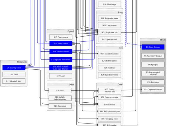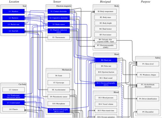 Based on the interconnections observed between the columns sensor, location, biosignal and purpose and the references found in the research, Wang et al. 4 concluded that there is higher or lower density of studies in each of the 4 dimensions and their sub-categorizations, which are represented by the lines between them and the filling of the box 4. Looking at the dotted lines between the columns"biosignal" and "purpose" (Figure 3), one will see the interconnection of "heartbeat (HR)" and "electrocardiography (ECG)" with "heart diseases" as being a natural promising possibility of future work; this is because both "heartbeat" and "ECG" have several interconnections when it comes to the application of sensors in vehicles. Thus, Wang et al. 4 showed that, despite the plethora of research on the development and application of ECG detection and HR measurement sensors, no studieshave been reported in the literature regarding theuse of the data collected for solving clinical problems (diagnosis).