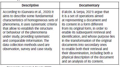 The method used is exploratory of secondary order, since a thorough search of bibliographic information of documents obtained in scientific databases such as Scopus, Springer, Scielo, Google Scholar, Researchgate, undergraduate, master's and doctoral theses was carried out. In order to meet the research objectives, a critical reading of the main selected bibliographic documents was carried out, which were subsequently classified and separated according to the information supporting the work.