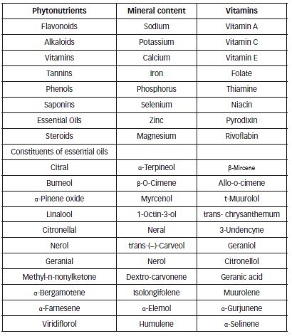 The volatile fraction is a prominent characteristic of lemongrass (Bandoni, 2003). Its essential oil yield fluctuates between 0.2 and 1.0 % depending on several factors such as the plant species, its origin, geobotanical conditions and cultivation, as well as extraction methods, duration and temperature (Jaramillo et al., 2017). The main and most abundant biologically active component is citral, a mixture of two monoterpene, stereoisomeric aldehydes from geranial and neral (Lopez, 2022). The bioactive components of lemongrass are listed in table 2.