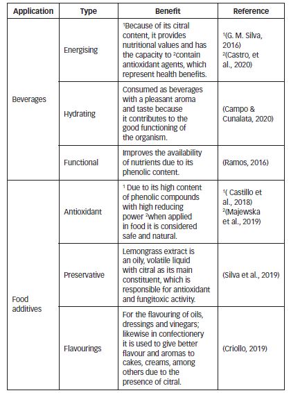 Forty-six scientific articles were analysed, of which 60% indicate the biological power and use of lemongrass extract in the food and non-food industry. After the literature review, the antibacterial and significant antifungal effect on Gram (+) and Gram (-) strains was identified, and as it is a promising source of antimicrobial chemical compounds, it was used in the food and non-food line. In the non-food field, myrcene, citronella, citronellal, citronellol and geraniol are the components that are most used, and in the food industry, the bioactive citral is used to give functionality to products, lower costs and avoid toxicity.The use of lemongrass extract plays an important role in the local and global industry due to its biological components that substitute, preserve and improve the final products offered in the food and non-food market.