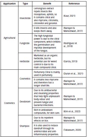 According to (Aćimović et al., 2020) C. citratus is considered to be of great interest in the industry because it has a rich source of bioactive compounds with a wide range of applications such as food and non-food as detailed in table 3.