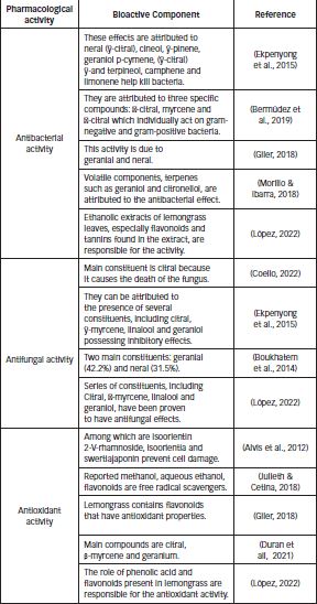 Plants produce a wide variety of secondary metabolites or phytochemicals, many of which have protective functions (Bermúdez-Vásquez et al., 2019b). Besides(Oliveira & Santos, 2021), state that C. citratus is widely used in industry for the properties it provides.This article aims to identify the biological compounds of lemongrass and their application in the food and non-food industry.