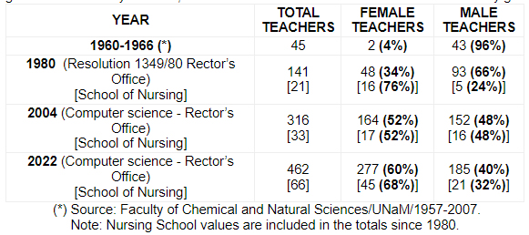 Table 1 shows that at the beginning of the creation of the FCEQyN, there is a large predominance of the male gender (96%), which declines over the years until reaching 40% in the year 2022. This could be explained by the incorporation from 1974 of careers belonging to health sciences, which have a gender distribution with predominance of female gender.