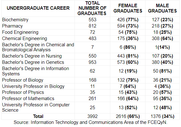 2-Gender distribution of graduates from FCEQyN undergraduate programs since its creation.