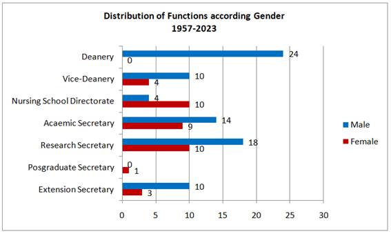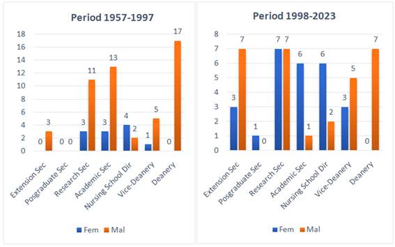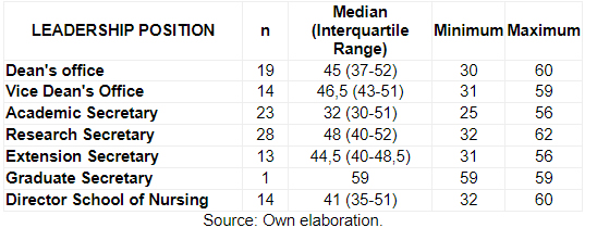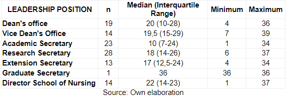 The majority of the female gender in leadership positions in the School of Nursing is explained by the composition of the graduates in the undergraduate career, where 81% are women, a career that, from its historical beginnings, was associated with tasks assigned to the role of the female gender, such as the care of the elderly and the sick.