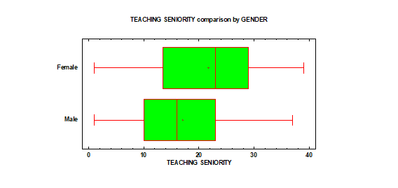 With respect to teaching seniority, the female sex assumed the position of head teacher with more years of experience than the male sex, 23 (IR: 13.5-29) versus 16 (IR: 10-23) years. In this case the differences were statistically significant (p=0.017).