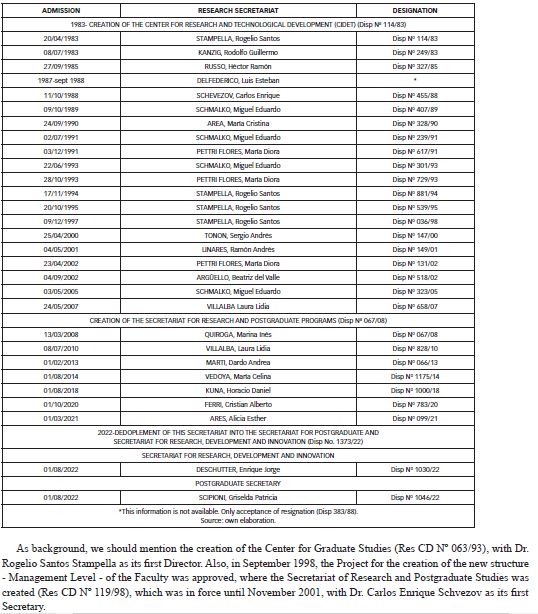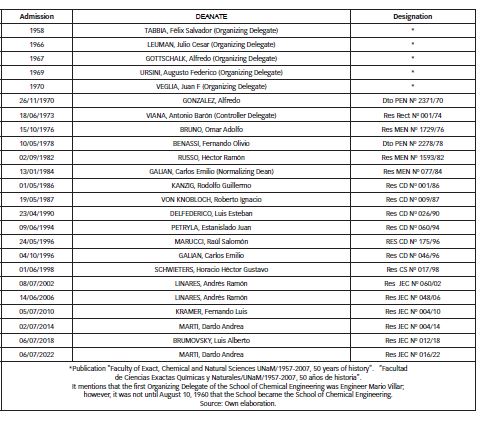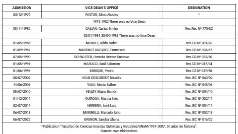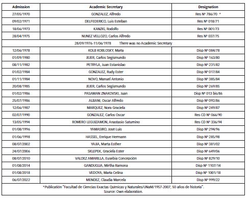 For the authorities that exercised their functions before the creation of the UNaM, the data published in the Faculty of Chemical and Natural Sciences/UNaM/1957-2007, 50 years of history, were considered. It was a produced by the Social Communication career of the Faculty of Humanities and Social Sciences, with Professor Liliana Maya as the responsible editor. The data published in the digital book FCEQyN were also used.