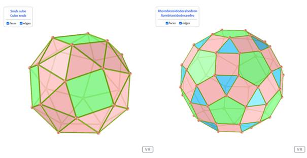 In 20 the codes used to represent each Archimedes polyhedron are presented using the symmetries and angles between edges and faces that define these solids. The modeling of Archimedes' polyhedra for creating the virtual rooms in this article is the same as that presented in the work presented in 20. Figure 1 shows the Snub Cube and Rombicosidodecahedron polyhedra modeled with the VR resources available for HTML programming with scripts and commands of A-Frame 21.