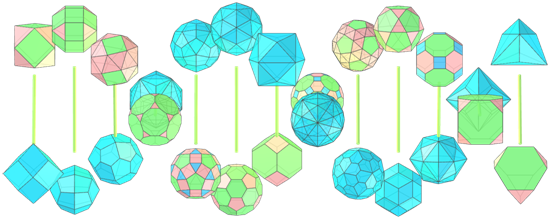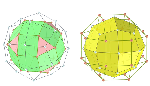 Consider Archimedes' Rhombicuboctahedron, which has 8 triangular faces, 18 square faces, 48 edges and 24 vertices (Figure 2). The correspondence between each face of this polyhedron with the vertices of the dual determines a solid with 26 vertices and 24 faces called Deltoidal Icositetrahedron. This is one of the Catalan polyhedra 18, 23. The edges of the dual polyhedron are orthogonal to the edges of the primal polyhedron, and the dual of the dual is always the primal polyhedron.
