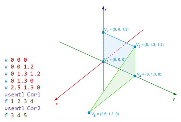 For example, a quadrilateral that has vertices 1, 2, 3, and 4 and a triangle that has vertices 3, 4, and 5 are defined in an obj file (Figure 3). Faces are defined with f commands, which have sequences of vertices defined in orderedv commands with 3D coordinates. Colors and textures can be defined in the materials file with mtl extension and the usemtl command.