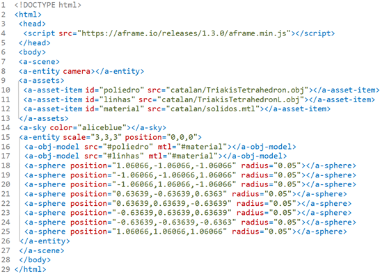 Figure 1 shows the block diagram of the Figure 4 shows the code for modeling a Triakis Tetrahedron in VR. Between lines 10 and 12, the links to the files containing the polyhedron and edges are defined. In lines 16 and 17, the polyhedra modeled in the scene are inserted. Finally, between lines 18 and 25, the a-sphere commands are used to represent the 8 vertices of the Triakis Tetrahedron. The other Catalan polyhedra are defined using the same HTML file type.