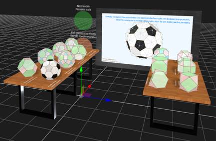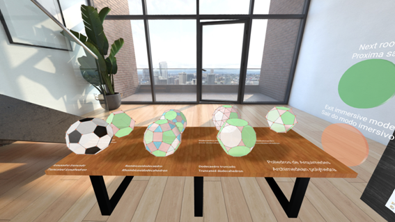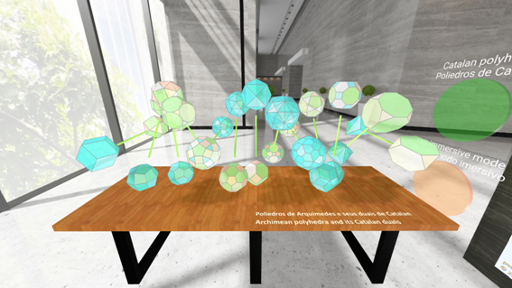 The modeled polyhedra by Archimedes and Catalan were inserted into VR immersion rooms, which can be accessed using any device. Support tables for the polyhedra, equirectangular background photos and a projection screen with the properties of some solids were inserted into the programmed environments.