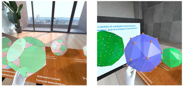 Using controls from immersive goggles, the click of a mouse or the touch of a smartphone or tablet, the visitor can move the polyhedra, change virtual rooms and leave the immersive environment. Figure 8 shows one of the tables with Catalan polyhedra, with the background image in equirectangular format 26. Figure 9 shows the use of Virtual Reality goggles manipulation controls in virtual rooms with Archimedes and Catalan polyhedra.