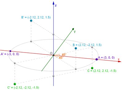 The construction of a DNA ribbon can be done using two cylindrical helices symmetric about the z axis. Consider the helix radius r = 3, and the first pair with an Archimedes polyhedron at point A and its respective Catalan dual in the symmetric position A’ (Figure 10).