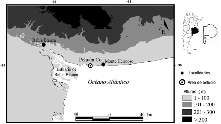 Pehuen Co se encuentra en el suroeste de la provincia de Buenos Aires, Argentina (Fig. 1). Fue fundada en 1948 y actualmente posee una población de 900 habitantes permanentes (Delegación Municipal de Pehuen Co). Este balneario presenta las condiciones de tamaño y vegetación necesarias para poder cumplir el objetivo del presente trabajo. Es una localidad costera sin zonas industriales ni edificaciones en altura. Las calles están sin pavimentar, hay áreas con poca vegetación y otras densamente arboladas con diversas especies de árboles, siendo los pinos y los eucaliptos las más comunes. El plano de la villa presenta una orientación este-oeste de forma paralela a la costa.
