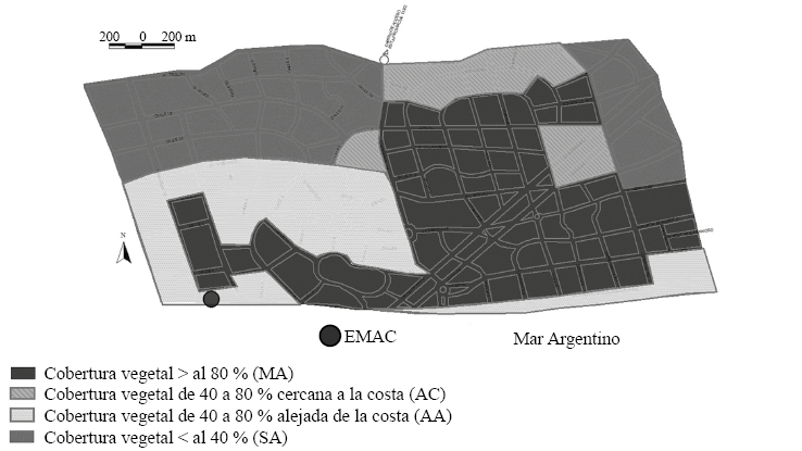 La distribución espacial de la temperatura del aire (Ta) en las diferentes áreas se obtuvo a través de mediciones in situ el 16 de junio de 2010 (con condiciones de tiempo típicas de un día de invierno) siguiendo la metodología descripta por García y Piccolo (2008). Las condiciones sinópticas fueron las óptimas: sin presencia de nubes y la velocidad del viento no superó la velocidad crítica de 6 km h-1 (estimada según Oke y Hannell, 1970). Las mediciones se realizaron utilizando dos vehículos, cada uno equipado con un termohigrómetro digital, un GPS y un anemómetro. El período de muestreo se extendió durante una hora y se realizó en dos momentos del día: a la mañana (7:00 h, hora local) y a la tarde (14:30 h, hora local). En ese tiempo los automóviles recorrieron toda la villa en sentido perpendicular (norte-sur) y paralelo a la costa (este-oeste) en forma simultánea y a una velocidad constante de 35 km h-1. Los datos fueron normalizados con una Estación de Monitoreo Ambiental Costero (EMAC) de referencia localizada al oeste de la ciudad (Fig. 2). Debido a que las muestras fueron no paramétricas, no cumplieron con el supuesto de normalidad y no tuvieron una relación entre la media y la varianza, los datos se analizaron con el test Kruskal-Wallis (α de 0,05). Este test se aplicó para determinar las diferencias entre los datos de la Ta en las distintas zonas vegetadas de la localidad.