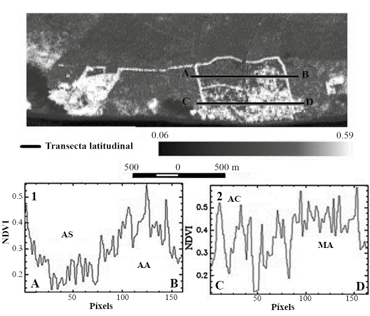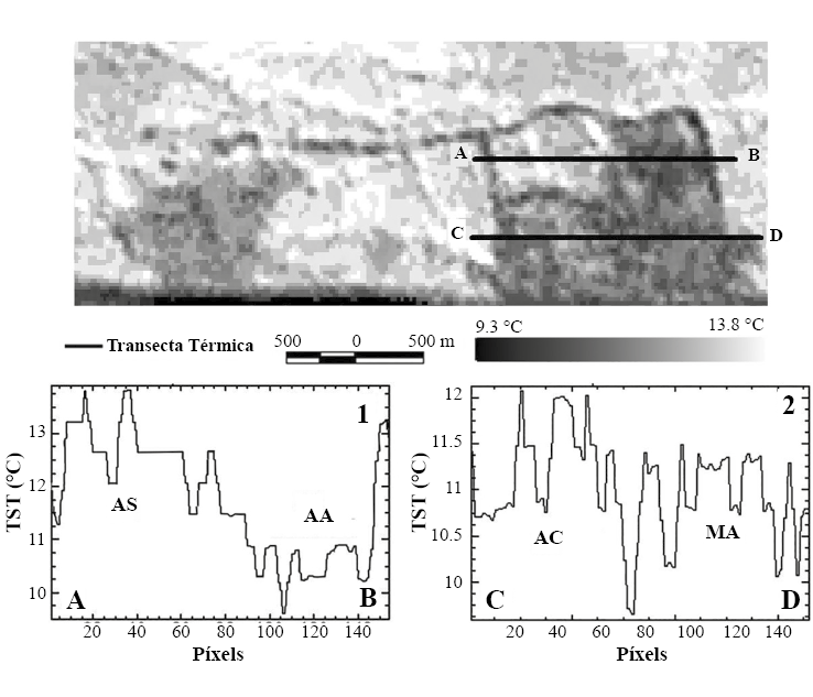 El NDVI fue tomado como un indicador de la biomasa y el estado de la vegetación en el interior de la ciudad. La TST se utilizó como indicador de la composición de la superficie, la rugosidad y el tamaño de los elementos (Valor y Caselles, 1996; Rivas y Caselles, 2004). La misma se analizó con el método monocanal, considerando las correcciones en el espectro solar y el método de Resta de Superficies Oscuras (Song et al., 2001; Schroeder et al., 2006; Carmona et al., 2011). Las variaciones espaciales de ambos parámetros se realizaron a través de dos transectas: 1) A-B: cruzó por las coberturas SA y AA y 2) C-D: que cruzó las áreas AC y MA (Fig. 3 y Fig. 4).