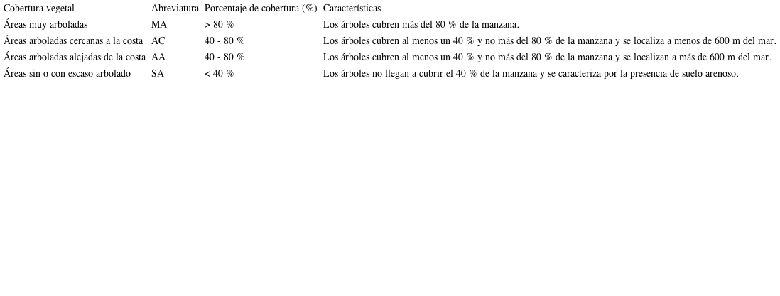 Se dividió la zona urbanizada de Pehuen Co en áreas según la cobertura de su arbolado (Tabla I). Si bien el plano es irregular, se tomó como mínima unidad de medición una manzana (espacio edificado delimitado por calles). Esta división se realizó a partir de recorridos de campo e interpretación visual de imágenes de Google Earth® (2010). Como resultado se obtuvo un mapa con las diferentes coberturas (Fig. 2).