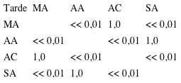 Durante la tarde, se observaron efectos de la influencia marítima. La Ta media fue mayor en la zona de AA (10,9 ºC) seguida por el área SA (10,6 ºC). Las zonas más frías fueron el área MA y AC con 9,8 y 9,6 ºC, respectivamente (Tabla II). El test Kruskal-Wallis permitió establecer que el área MA presentó respuestas térmicas similares al AC y diferente al AA y el SA. Esto demostró que en horas de la tarde la influencia de la cercanía al mar fue más fuerte en áreas donde la cobertura de vegetación fue entre 40 y 80 % y cercana a la costa. Se generó un descenso de la Ta debido a la protección de los árboles de la radiación (Tabla III). Sarricolea y Romero Aravena (2006) y Oltra-Carrió et al. (2010) demostraron que la vegetación es un factor importante para mitigar la intensidad de la temperatura. Además, las áreas verdes reducen las temperaturas, ya que disminuyen la emisión de onda larga (Dimoudi y Nikolopoulou, 2003).