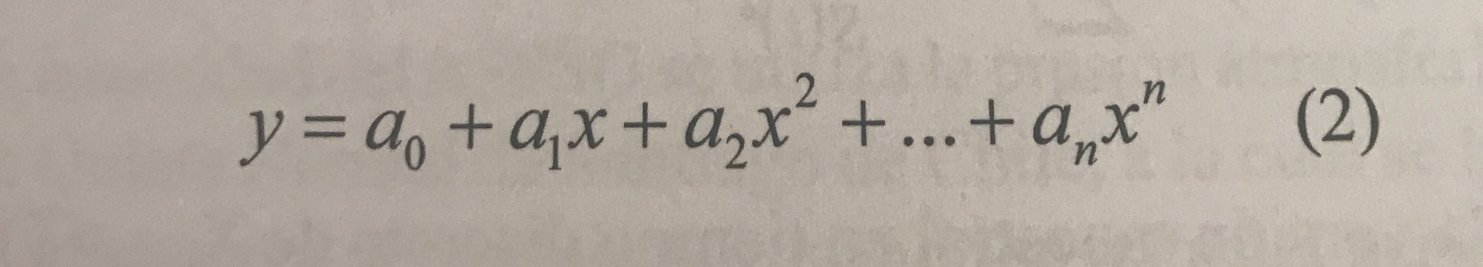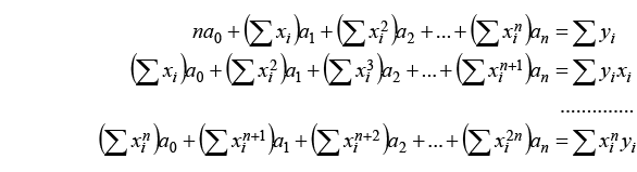 (2)Donde y es la variable dependiente, x la independiente y los ai son los coeficientes a determinar mediante las siguientes ecuaciones normales: