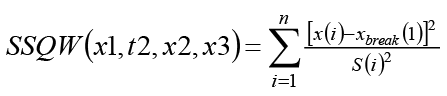 La ruptura (break) describe un cambio en la tendencia lineal en un punto (t2, x2), a partir de las pendientes β1 a β2 correspondientes a las rectas anteriores y posteriores al quiebre. Asumiendo que la desviación estándar S (i) mide la variabilidad, el modelo de quiebre se ajusta mediante la minimización de la siguiente suma de mínimos cuadrados ponderada: