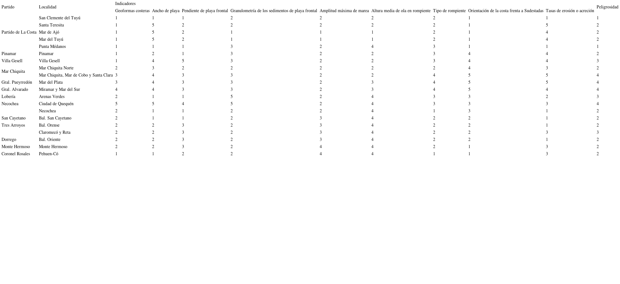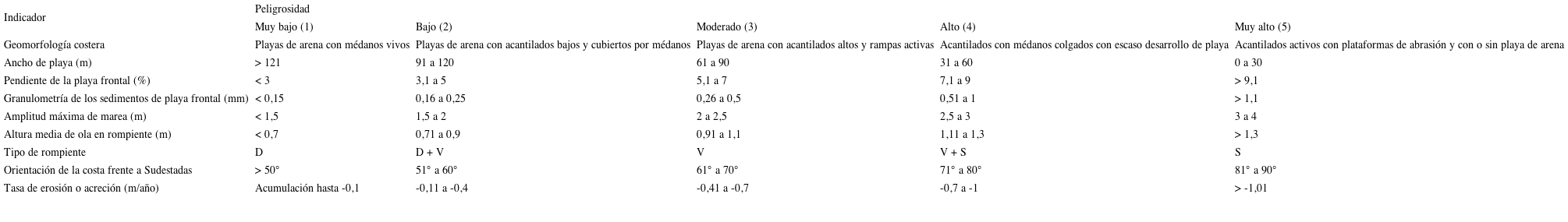 El índice de peligrosidad está compuesto por nueve indicadores: geomorfología costera, ancho de playa, pendiente de playa frontal, granulometría de los sedimentos de playa frontal, amplitud máxima de marea, altura media de ola en rompiente, tipo de rompiente, orientación de la costa frente a Sudestadas y tasa de erosión o acreción (Tabla I). El índice de vulnerabilidad abarca once variables que involucran aspectos demográficos, educativos, sanitarios, de salud, económicos, productivos, laborales y de exposición de la población. Estas variables fueron agrupadas en tres indicadores: demográfico, condiciones de vida y trabajo y consumo.