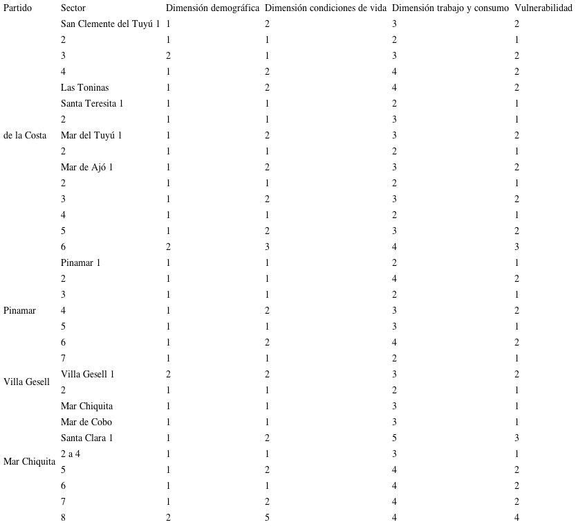 En los partidos de La Costa, Pinamar y Villa Gesell (Tabla III), todos los balnearios presentan una vulnerabilidad muy baja y baja. Solo presenta una vulnerabilidad moderada el sector sur de Mar de Ajó en el partido de La Costa (Fig. 2).