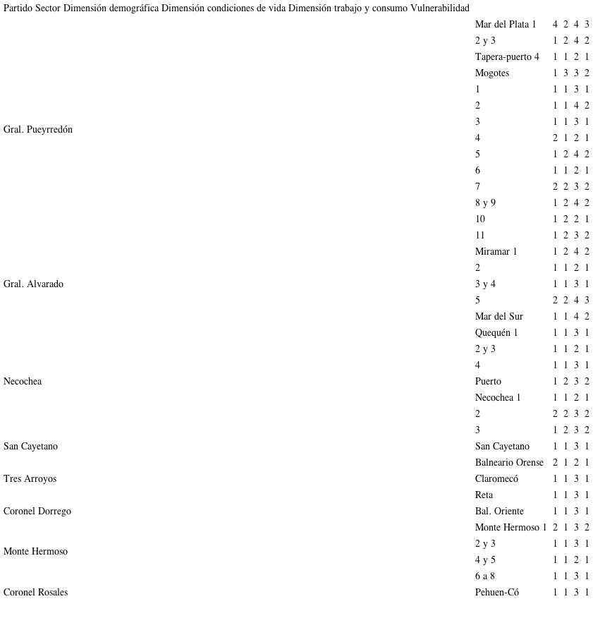 En el partido de Mar Chiquita (Tabla III), los balnearios Parque Mar Chiquita y Mar de Cobo presentan una vulnerabilidad muy baja (Fig. 2). La vulnerabilidad se incrementa en Santa Clara del Mar hasta un valor alto. El partido de General Pueyrredón registra vulnerabilidades muy baja, baja y moderada. El sector con vulnerabilidad moderada está localizado próximo al norte del partido, mientras que en el resto de la franja costera alternan las otras categorías mencionadas (Fig. 2).