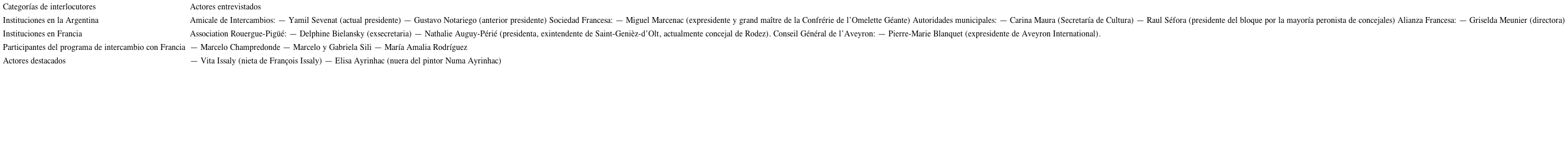 La metodología se apoya en la recolección de los discursos sobre sus acciones de los principales protagonistas del proceso de patrimonialización, en entrevistas semidirigidas. Luego, se realiza un análisis estructural de estos relatos de acción (Demazière y Dubar, 1997) para entender la lógica de cada actor y, finalmente, un análisis transversal temático de todas las entrevistas, buscando las huellas del pasado francés. Ese enfoque explica, en particular, el estilo directo del texto y las referencias a personas concretas como casos representativos. Con la finalidad de contribuir a un mejor conocimiento de la historia local, siguiendo la opción adoptada por todos los estudiosos de Pigüé, en particular, en el libro de referencia sobre esta localidad (Andreu, Bennassar y Gaignard, 1977), hemos decidido conservar los apellidos reales de las familias, con todo el respeto que debemos a los actores entrevistados. En efecto, hubiese sido imposible esconder esa identidad para los dos tercios de ellos, debido a su rol particular en la historia local que permitiría fácilmente identificarlos y, de todos modos, para todos y cada uno figurar explícitamente en la historia local es un hecho asumido. Para realizar esta investigación hemos llevado a cabo quince entrevistas ―de alrededor de dos horas cada una― a los actores locales y también a algunos actores de la cooperación con Francia que hemos entrevistado en el Aveyron (Tabla I).
