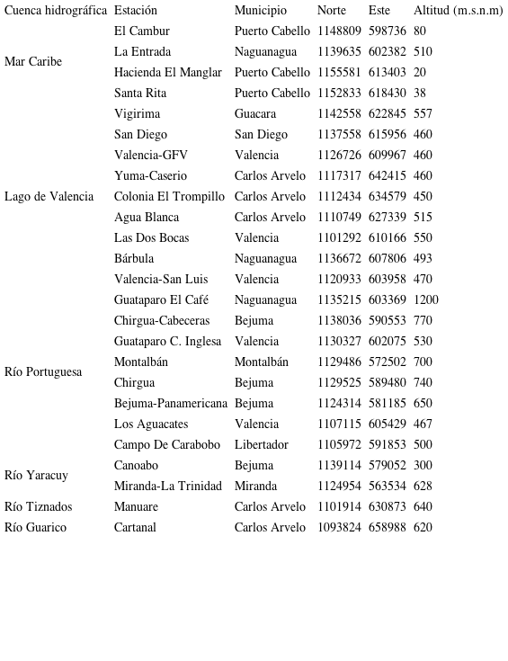 El estado Carabobo está localizado en la zona centro-norte del país, entre las coordenadas geográficas 09° 48′ y 10° 35′ de Latitud Norte y 67° 31′ y 68° 26′, de Longitud Oeste (Tabla I). Está constituido por catorce municipios; posee una superficie de 4651 km2 de los cuales solo el 42,53 % (1973 km2) es considerado como territorio potencial para la actividad agrícola (INE, 2011).