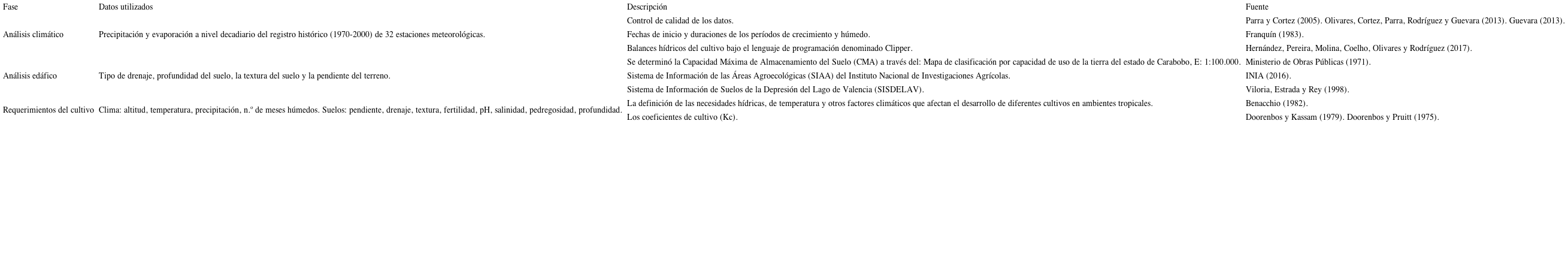La definición de los requerimientos del maíz se realizó por medio de los aportes de Benacchio (1982), quien compiló las necesidades hídricas, de temperatura y otros factores climáticos que afectan el desarrollo de diferentes cultivos en ambientes tropicales (Tabla III).