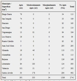 Uno de los principales problemas en Carabobo se relaciona con la falta de atención a la aptitud de las tierras para los diferentes tipos de utilización, lo que puede generar serios conflictos de usos de las tierras y, con ello, bajos rendimientos de los cultivos, así como degradación de los recursos naturales de la zona (Sevilla y Comerma, 2009).