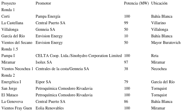 Los 13 proyectos eólicos bonaerenses buscan localizarse en la región SUBA, en los partidos de Bahía Blanca, Villarino y Tornquist, y sobre la costa atlántica, en torno a las ciudades balnearias de Reta, Miramar y Necochea. La mayoría de los proyectos son de una potencia que ronda entre los 100 y 50 MW y solo hay dos iniciativas menores a 50 MW. Entre las principales empresas ganadoras de las adjudicaciones en la región, se encuentran cuatro empresas internacionales y seis firmas nacionales, en su mayoría provenientes del rubro eléctrico e hidrocarburífero. Entre las extranjeras se destacan las españolas Isolux Ingeniería SA y Eolia Renovables y la china Envision Energy. Las empresas Petroquímica Comodoro Rivadavia y Central Puerto SA representan las que reúnen más potencia entre los promotores nacionales.