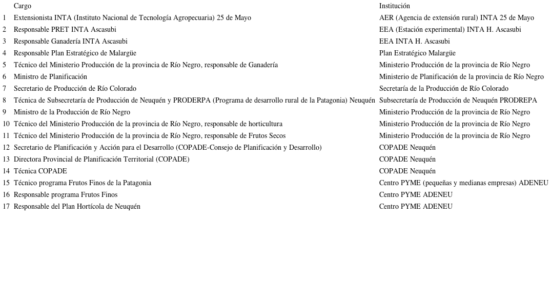 b) En segundo lugar, se realizaron dos series de entrevistas semiestructuradas en toda la región a diferentes actores productivos y gubernamentales. Inicialmente, se aplicó una entrevista a informantes calificados, capaces de brindar información de calidad, basada en su experiencia en el territorio. La selección de estos actores se realizó a través de un muestreo intencional, considerando la trayectoria de la persona. En total se realizaron 17 entrevistas semiestructuradas a funcionarios públicos de las provincias y municipios de Mendoza, Río Negro, Neuquén, La Pampa y Buenos Aires y a referentes técnicos de instituciones de investigación de estos territorios, tal como lo detalla la tabla I.