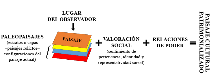 Esta dimensión temporal en el paisaje es clave, dado que las formas del espacio geográfico que se perciben en la actualidad no son idénticas a las de otros momentos pasados, sino que se han creado y recreado, a partir de filtros y valores empleados por las diversas sociedades y sus representantes políticos, económicos, científicos, etc. A estos procesos, cabe añadirle la carga afectiva, estimaciones, anécdotas y experiencias vividas por los sujetos; en consecuencia, valoradas o justipreciadas. Con lo cual se alude al paisaje cultural patrimonializado, entendido como el cúmulo de componentes (materiales, inmateriales y/o simbólicos), actores sociales (sociedad civil y las organizaciones que la representan, sectores público y privado, ámbito científico, etc.) y las dimensiones físicas y subjetivas del espacio (natural, cultural, histórica, política y económica), yuxtapuestas en/con el tiempo, todo ello en interacción y con una valoración social dada (Suden, 2022).