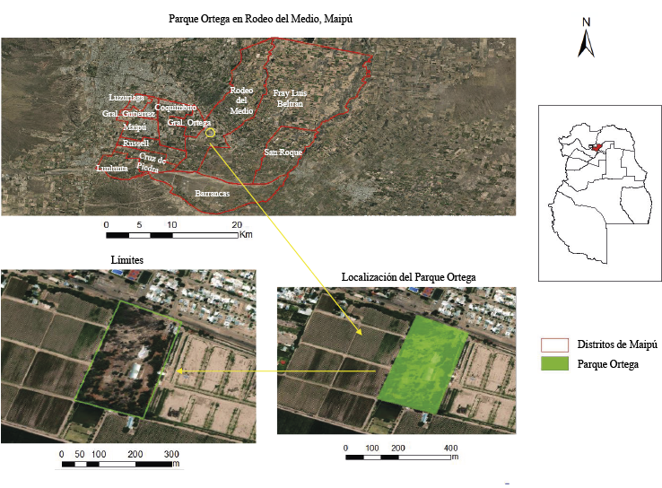 El Parque General Ortega se ubica en el distrito de Rodeo del Medio, departamento de Maipú, Mendoza, Argentina (Fig. 4). Su superficie actual es de 4 ha, que albergan una gran diversidad de especies animales y vegetales. En su interior, el espacio contiene una piscina, baños y otras instalaciones que rememoran el camping y sitio de esparcimiento y sociabilización que fuera antiguamente.
