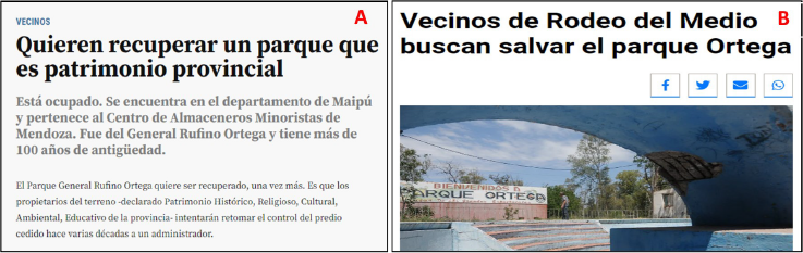 Diario Uno, (2018, febrero, 10). Vecinos de Rodeo del Medio buscan salvar el Parque Ortega. Recuperado de: https://www.diariouno.com.ar/mendoza/vecinos-de-rodeo-del-medio-buscan-salvar-el-parque-ortega--02102018_BJe7VewnLM