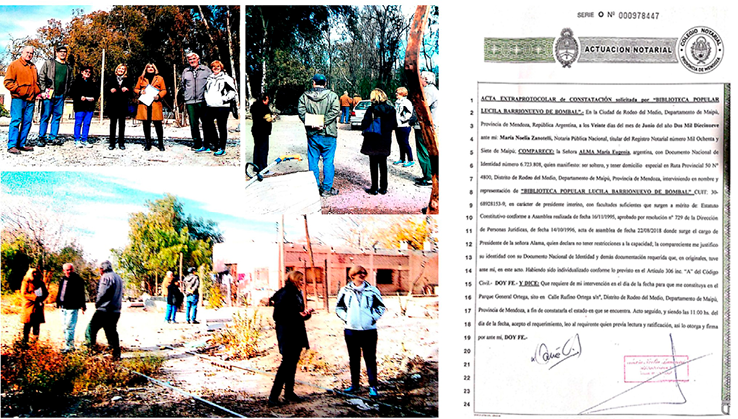 Con lo cual se observa que la comunidad de Rodeo del Medio, desde sus orígenes, ha buscado incorporar el Parque Ortega dentro de los espacios a disfrutar públicamente y con el cual se siente representada. Se destaca su apego al lugar y su actitud proactiva reflejada en variadas acciones que han realizado durante más de dos décadas, brindando su tiempo, capacidades, trabajo y hasta recursos económicos. El último producto de estas acciones se obtuvo el 20 de junio de 2019, día en el que se creó la Comisión Pro-recuperación del Parque Ortega, con presencia de una escribana pública y miembros de la comunidad (figura 6). Con ellos se dejó constancia del estado de abandono de este. Además, en esa acta comparecieron actores en representación de la Biblioteca Popular Lucila Bombal, de Rodeo del Medio.