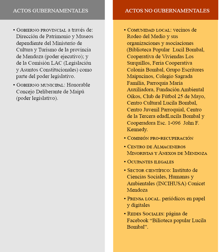 Sobre la base de esta clasificación, se presenta el entramado de actores vinculados al proceso de patrimonialización del parque (Fig. 9). Como puede observarse, como actores gubernamentales o públicos se destacan los gobiernos de gestión municipal y provincial a través de sus distintos poderes. Y dentro de los actores no gubernamentales o privados, se hallan la comunidad local y sus diversas organizaciones y asociaciones que pujan por la demanda colectiva, el actual propietario del parque (Centro de Almaceneros Minoristas y Anexos de Mendoza), los ocupantes ilegales y los expertos, en este caso investigadores del Instituto de Ciencias Humanas, Sociales y Ambientales (INCIHUSA) del Consejo Nacional de Investigaciones Científicas y Técnicas de Argentina (CONICET), como promotores del conocimiento y acompañantes en el proceso de efectiva patrimonialización y refuncionalización del parque. Finalmente, los medios de comunicación (prensa local, redes sociales) acompañan, potencian y difunden la situación.
