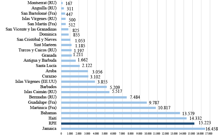 Otro indicador para analizar es el cálculo de la Rph. Los 356 hoteles de playa relevados tienen la capacidad de generar 15.223 millones de U$ en carácter de Rph (Fig. 9). Este valor representa el 94,1% de la Rph calculada en toda la región (16.178 millones de U$). En primer lugar, para tomar dimensión de la potencial riqueza que genera el negocio hotelero en los enclaves de playa consideramos apropiado comparar la Rph con el PBI de los países y territorios del Caribe. En la figura podemos visualizar como la suma de la Rph de las 43 corporaciones hoteleras que operan en las playas de las islas caribeñas es mayor que el valor monetario de la producción de bienes y servicios de la mayor parte de los Estados dependientes e independientes de la región. El valor de la Rph es cercano al PBI de Jamaica (16.458 millones), que es una de las economías de mayor tamaño de las islas del Caribe, superada solo por Trinidad y Tobago (que tiene renta petrolera), Cuba, República Dominicana y Puerto Rico.