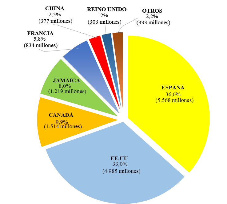 Es importante agregar como variable la nacionalidad de la casa matriz de las cadenas hoteleras, ya que el carácter internacional de estas empresas es lo que nos permite dimensionar el desarrollo de la IED sectorial en el Caribe y cómo esto contribuye a sostener mecanismos neocoloniales en el funcionamiento de las economías locales. Lo primero a destacar, respecto al origen del capital hotelero, es que de las 43 empresas que operan en las playas caribeñas 15 son españolas y 13 estadounidenses las cuales, en conjunto, controlan casi tres cuartas partes (74,9%) de la oferta habitacional (98.923) del total relevado en los enclaves de playas y concentran el 69,6% de la Rph, esto es, 10.593 millones de U$ (Tabla II y Fig. 10).