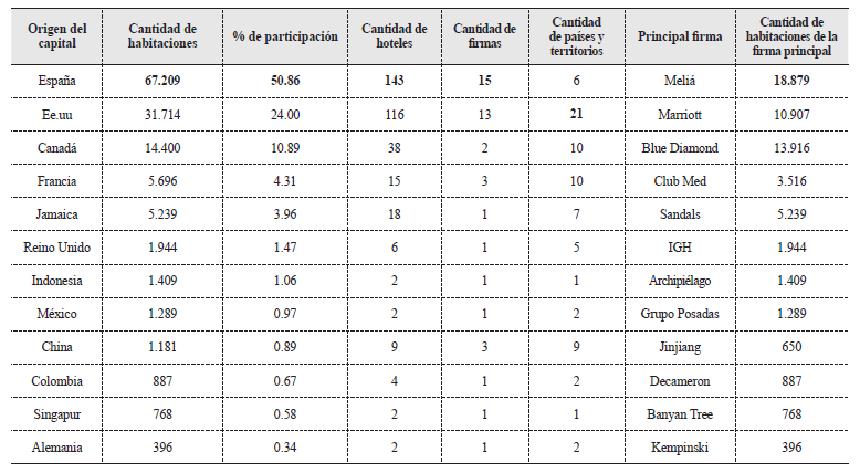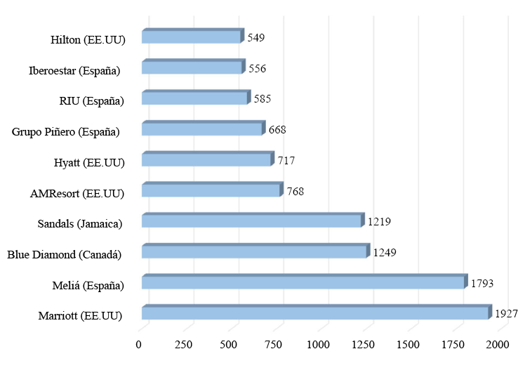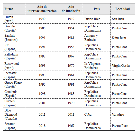 Lo primero a destacar en los resultados cuantificables es que de las 300 cadenas hoteleras más grandes del mundo (en cantidad de habitaciones), 43 (14,3%) operan en la región, de las cuales 12 han inaugurado su expansión internacional en el Caribe (Tabla I). La región, junto a las Islas del Pacífico (Melanesia, Micronesia y Polinesia), son las únicas regiones insulares que, en una superficie reducida, concentran varias cadenas hoteleras internacionales. Esta densidad se debe a que el mercado pone en valor la condición de exclusividad y singularidad que se experimentan en la geografía de una isla, con ecosistemas y climas tropicales, y con culturas que la habitan calificadas como exóticas por la mirada etnocentrista occidentalista.