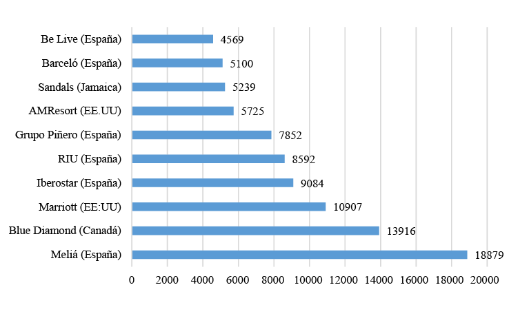 En lo que respecta a la cuantificación del fenómeno, se seleccionaron de las 300 principales corporaciones hoteleras del mundo3 aquellas que operan en la región estudiada con la finalidad de medir su desarrollo territorial por medio de una serie de indicadores que dan cuenta de su grado de inserción en las playas caribeñas4. Algunos de los indicadores utilizados son los que se reiteran en estudios sobre turismo: número de establecimientos hoteleros, cantidad de habitaciones y costo promedio de una habitación. Se agregan a estos, el país de origen de la cadena hotelera como dato que aporta a dimensionar el rol de la IED en la composición del capital hotelero de la región.