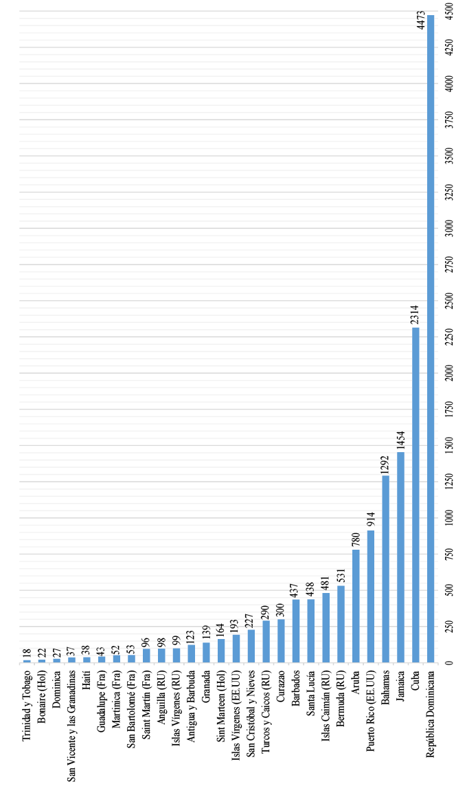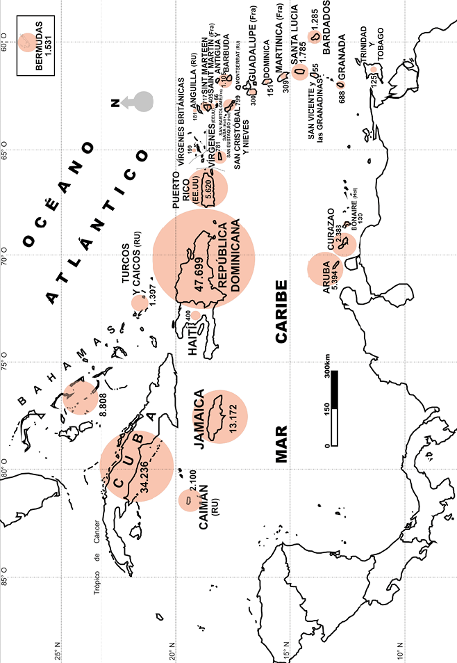 Por último, cerramos el análisis de los datos obtenidos en los relevamientos examinando y agrupando los resultados por país o territorio de ultramar (Fig. 13 y Fig. 14). Por un lado, está el grupo de países que componen las Antillas Mayores (a excepción de Haití25): República Dominicana, Cuba, Jamaica y Puerto Rico. A estos, hay que sumar las Bahamas que, aunque no forme parte del grupo geográfico de islas del Mar Caribe, es por su superficie (13.880km²), conformada por más de 700 islas y cayos, un país de mayor extensión que Jamaica (10.992km²) y Puerto Rico (9.104km²). Tal cualidad, le permite contar con numerosas playas para la explotación turística. Este grupo de cinco países concentra la mayor parte de la oferta hotelera (83%) con 109.686 habitaciones y el 70,9% de la Rph (10.788 millones de U$) relevada. Además, de los 71 enclaves de playa en los que operan algunas de las firmas hoteleras medidas, 29 forman parte del territorio de este grupo de países. Esto se debe, en parte, a la disponibilidad de playas tropicales y al estímulo que las administraciones públicas le confieren a la actividad turística por medio de facilidades y ventajas para el asentamiento de las IED sectoriales y de las garantías jurídicas y financieras.
