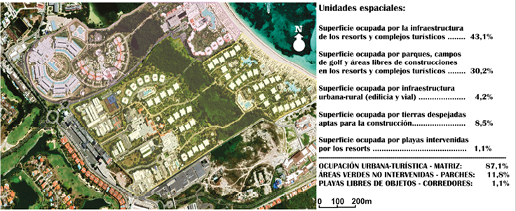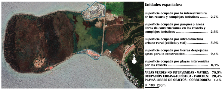 Por otro lado, teniendo en cuenta de que se trata de un estudio centrado en la playa como principal atractivo turístico, un indicador importante es si los hoteles tienen, o no, acceso directo a la playa5 o si forman parte del frente costero6. Esto último, tiene como finalidad corroborar la tendencia a la litoralización del desarrollo urbano-turístico en los principales destinos y la redefinición de patrones paisajísticos por el accionar conjunto del capital, abordados en el trabajo a través de la propuesta conceptual-metodológica de la Ecología de Paisajes. El método consistió en definir y medir, en imágenes satelitales correspondientes a áreas de playas turísticas caribeñas, los elementos que componen la estructura del paisaje: matriz, parche y corredor (Cushman, Evans y McGarigal, 2010). Esto, para exponer cómo las diferentes formas de ocupación del espacio costero en los distintos enclaves de playa responden al grado de desarrollo y acumulación del capital hotelero.