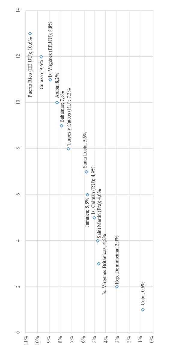 En la figura 16, pueden apreciarse los resultados obtenidos en diferentes países y territorios en los que se consiguió información sobre los salarios iniciales del sector medido. El resultado más importante a destacar son los bajos valores de participación del salario en todos los casos. El caso de mayor participación fue registrado en Puerto Rico, el cual dio como resultado que con sólo un poco más de la décima parte de la Rph que puede generar una sola habitación en un mes, se cubre el salario básico de un trabajador inicial que la limpia y asea en forma diaria. En los demás países, el valor es inferior al 10%. En el extremo, además de Cuba (0,6%), está República Dominicana con 2,9%. Ambos países concentran el 44,8% de la Rph y el 62,3% de la oferta habitacional, por lo tanto, son los que más fuerza laboral emplea en hoteles internacionales y que más plusvalía hotelera generan en beneficio de las empresas. La baja participación en República Dominica implica que con lo que genera de ganancia una sola habitación en un complejo hotelero de playa podría abonarse más de 34 salarios de las cualidades seleccionadas. En el caso de los enclaves de playa con menos oferta hotelera y mayores precios por los servicios (como Islas Vírgenes Británicas o Saint Martín), la participación en las ganancias de los trabajadores sigue siendo muy baja debido a que, si bien es cierto que los salarios son mayores, la Rph por habitación también es mayor y la plusvalía que se genera también lo es.