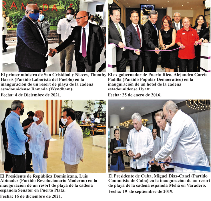 La consolidación de verdaderos “Estados turísticos” instala en el eje político de los países y territorios de la región a las corporaciones hoteleras internacionales amalgamando a gobiernos locales con empresarios del sector. Prueba de ello es la presencia de líderes de gobierno en cada una de las inauguraciones de los resorts de lujo (Fig.17). La combinación entre empresas que buscan ganancias por el lado de la reducción en los costos de construcción y puesta en funcionamiento de sus propios enclaves hoteleros, con regímenes políticos que accionan para que las corporaciones alcancen sus objetivos gananciales, no ha aportado a un desarrollo distributivo. El argumento de que el derrame son los empleos que demanda el sector no es válido, debido a que los bajos salarios que se abonan quedan por debajo de la canasta familiar. Además, la paradoja es que el costo laboral forma parte de las ventajas comparativas y competitivas para el desarrollo del capital hotelero internacional en detrimento de las condiciones materiales de existencia de los trabajadores y sus familias.